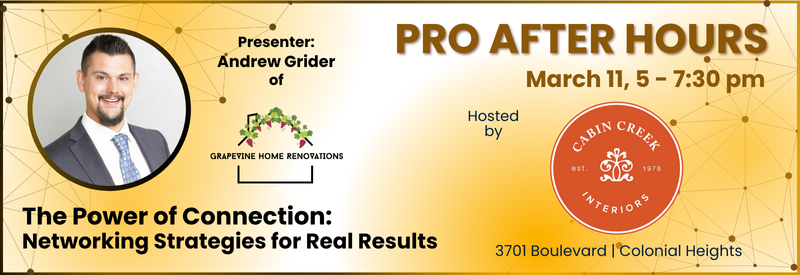 Join us at Cabin Creek Interiors for networking and an educational presentation on Networking Strategies by Andrew Grider of Grapevine Home Renovations.